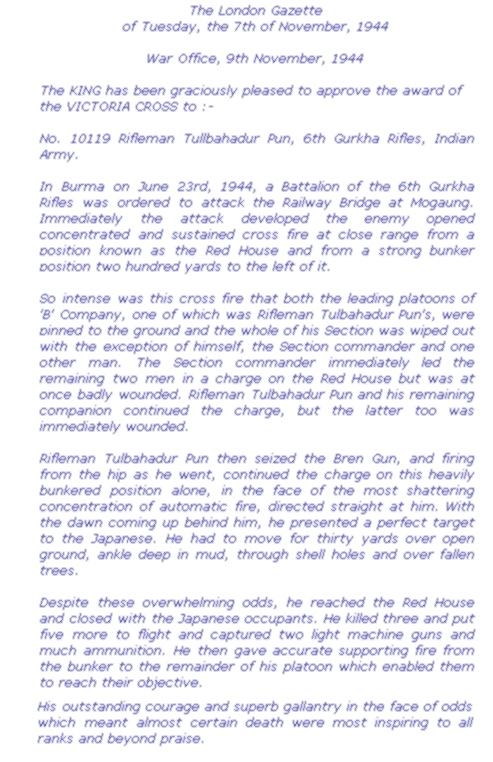 Tul Bahadur Pun VC in 2007Tul Bahadur Pun VC (born 23 March 1923) is a Nepalese recipient of the Victoria Cross, the highest award for gallantry in the face of the enemy that can be awarded to British and Commonwealth forces. In addition to the Victoria Cross, Mr Pun VC has been awarded 10 other medals, including the Burma Star.......