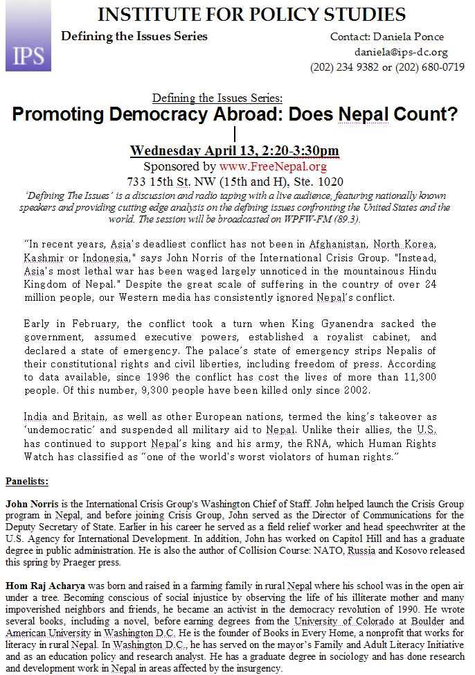 Talking about the show, here is a show (a radio show recording with live audience) once again in DC and once again with Homraj Acharya ji, this time together with a big shot from very influencial think tank, International Crisis Group represented by it's Washington Chief of Staff, John Norris. What: Radio Panel discussion (Defining the Issues Series: Promoting Democracy Abroad: Does Nepal Count?) When: Wednesday April 13, 2005 (2:20-3:30 pm) Where: 733 15th St. NW (15th and H), Ste. 1020 Washington, DC
