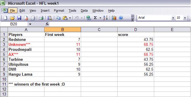 ProudNepali bro, Everything is cool this side of the world. Except for my predections. Redstone, thanks for taking the charge and posting the spreadsheet. DWI, peace... I guess, I'll start the upcoming week...Here are my picks...Let's hope this one is better than the last one.. Baltimore VS Tennessee...Baltimore Bills VS Buccaneers.....Buccaneers Detroit VS Chicago....Detroit Jaguars VS Colts.......Colts Minnesota VS Cincinnati.....Minnesota Patriots VS Panthers....Patriots Pittsburgh VS Houston....Pittsburgh 49ers VS Eagles.....Eagles Atlanta VS Seattle....Atlanta Rams VS Cardinals....Rams Cleveland VS Green Bay...Green Bay Dolphins VS Jets....Dolphins San Diego VS Denver....Denver Chiefs VS Raiders....Chiefs New York Giants VS New Orleans....New York Giants Redskins VS Cowboys....Redskins Good Luck to all..