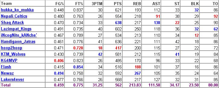 whats up ballers...well may be not really ballers but at least we all like to fantasize about it :p thanks bandi bro for the stats again...its very gracious of you to do this every week for us. i had a mediocre week and won some close category against celtics but not all that excited about a 6-3 victory. going against the no.1 and hottest team in the league lazimpat kings this week, so i'm looking forward to it. seems like by now everyone have had a chance to analyze their players now we need to start addressing our needs. i will be expecting some blockbuster transaction to take place in the near future. if i get a chance i will try to come up with my self proclaimed expert analysis of every team in the league so far.