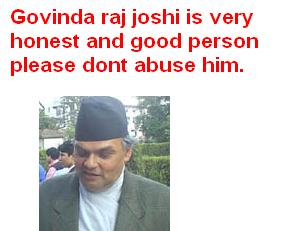 Namaskar Sathi Haru I am Tanahun and just came to USA so called land of oppertunity. And I am proud lots of Nepal living abroad know the reality of Nepal. Govinda Joshi is no better than a "Danda" -- "chor". He has done nothing -- nothing for Nepali and Nepali. I am from Chundi Tanahun. I can say clearly he has done nothing for Tanahun. Except his "few" people became rich -- very rich. One example is his mother in law now has 3 Karor in her bank. About Joshi? No one knows how much he has. I am sure he is top 10 rich people in Nepal. Lets isolate this "chor" in Nepal for good. Lets do our best what we can. Namaste Nabin