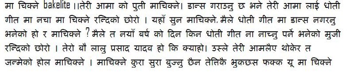 देशभक्तनेपाली! भन्न त त्येई खोजेको हो, तर फेरी यहाँ धोती भन्छन कि भनेर पीर पर्यो. हुन त तिमीले भनेको एक रोपनी सही हो, तर के गर्ने? जे जस्तो भए पनि हामी नेपालीहरु एक आपसमा झगडा गरेर नै आफ्नो चित्त बुझाउछौ। यही नै हाम्रो लागि गर्वको कुरा हो जस्तो छ!! यो चाँही अरुको लागि!! बाइ द वे, यही फेरोसिटी नेपालमा भएको कोरपसन र नेपोटिस्मलाई देखाएर धागो शुरु गरीए केही त ठीक हुन्थ्यो होला। बेकारमा कस्ले कुन गीतमा नाच्यो कस्ले कस्को गीत गायो भनेर कूर्लेको छ छ। छु मतलब?