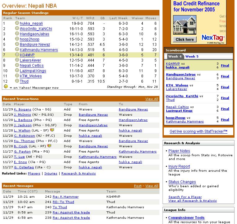 will do from next week... unkown I thought you had the lineup, what's going on??? your team seems to be below avg on every category :=) how about trade??? M. Bibby is avail i read somewhere that KG wants outta Minny..... he seems to be interested playing at Madison Square Garden, The Mecca of Basketball..... NYers deserve a superstar like him... but I don't think KG is the player who will take your team to PRMOISELAND... he is a great player but I don't think he makes players around him better. Same thing goes with Kobe and Stephon Marbury, the best PG in the league :p How akward will that be to see Steph and KG sharing the court again.... and here's the million dollar Q, how much knicks going to pay him? we all know Knick like to overpay for every players they acquire.... If i get to vote I say NO to combo of Steph and KG I know lotsa Wolves frequent this site...... so spare me being critical of KG How about the best team in LA, THE CLIPPERS ;) ya ppl didn't believe me, did ya