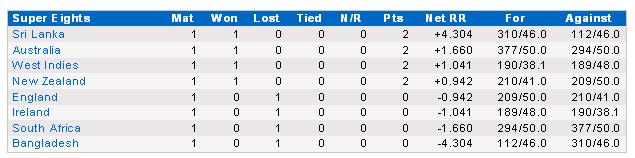 1. Tuesday, March 27 West Indies v Australia: .....>Australia by 75 runs or 4 wickets 2. Wednesday, March 28 South Africa v Sri Lanka...>Sri Lanka by 38 runs or 3 wickets 3. Thursday, March 29 West Indies v New Zealand....>New Zealand by 25 runs or 2 wickets 4. Friday, March 30 Ireland v England.......> England by 90 runs or 4 wickets 5. Saturday, March 31 Australia v Bangladesh...>Australia by 100 runs or 6 wickets