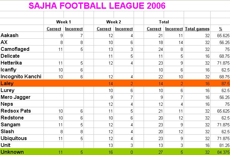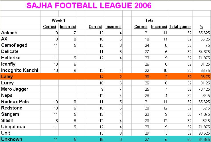 ok here's the score. congratulations to Laley and Unknown bro. Lalaey is the overall leader and Unknown bro is perfect this week. Sorry for being late to post the score. 16 credits is too much work.   Pardon me on that fellaz.