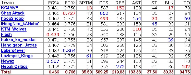Thanks again for the stats AX bro! I think you and i are like the celtics and the lakers of back in the days or today's spurs and mavs...year in and year out we find the way to get it done! LOL KG4MVP bro might be the bulls after the jordan dynasty going through some rough years. ktm_wolves might be the clippers of this year...ugly days are behind him and he's a serious contender! shaq attack might be the trail blazers of the past few years....great on the draft night...not so much during the regular season (no offence bro!) hoop2hoop is the golden state warriors of the league. plagued by injuries in the previous seasons and same again this year...if the core group of guys can stay healthy for even 75% of the season...watch out for this team! now, nepali celtics...it will be unfair for me to compare this team to any other except for his beloved boston celtics. had have seasons like the celtics of the late 90s and early 00s. always there in the mix but something is missing to get over the hump to get to that next level. same goes for lakers4ever...just like the LA lakers his team is gonna go as far as kobe takes him. no doubt he's one of the greatest player but in this day and age can you win championship with only one of the greatest players (KG and the wolves would say NO). flash -- roster looks as solid as it comes on paper but on the floor it is just not producing or may be just palying the wrong opponent at the wrong week. this team is like the present day chicago bulls....has all the nucleus, GM just needs to be patience to let them jel. lazimpat kings, hadigoan jatras, incognito kanche are like your huston rockets, nj nets, or the wizards of the last few years...mostly always make it to the post season have major superstarts in the roster but have gotten overshadowed by the big dogs late in the post season matchup. so i hope these teams have learned from the past and make the necessary adjustments to take them to the promise land. last but not the least...hope i didn't offened anyone with my analogies...i mean as long as i didn't compare you to the ny knicks of the 2000s LOL ok folks have a nice day!