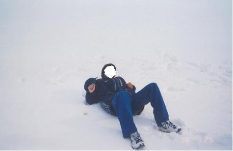 लौ मेरो पहिलो विन्टर को हिउ, यो एउटा जमेको ताल माथि खिछेको फोटो हो । मुख पनि हिउ ले छोपिएछ।