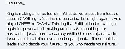 NOTE: The opinions here represent the opinions of the individual posters, and not of Sajha.com. It is not possible for sajha.com to monitor all the postings, since sajha.com merely seeks to provide a cyber location for discussing ideas and concerns related to Nepal and the Nepalis. Please send an email to admin@sajha.com using a valid email address if you want any posting to be considered for deletion. Your request will be handled on a one to one basis. Sajha.com is a service please don't abuse it. - Thanks.