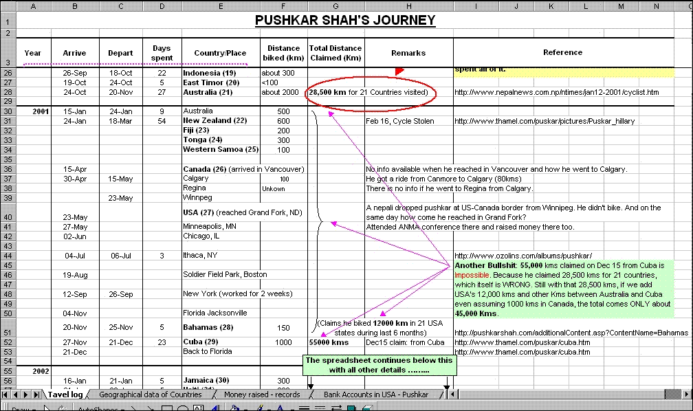 It looks like the people are making the subject of pride just to emphasize on where they stand about Puskhar Shah. I wouldn't believe it should be a matter of pride to present raw datas. I wouldn't worry even the data has some thousands + or - . The importance here is how someone can sacrifice 11 years just for cycling. It is certainly not a joke. Yes, name and fame comes to that person who has courage and determination. A good thing for Nepal. Personification of "Gurkha" is Puskhar Shah. Even if you have millions of dollars, you can't easily set a journey (of uncertainity) like that. Even if you love cycling, you can't bike 5-15 hours literally everyday for 11 hours. You need determination and real courage, and of course a Nepali maan. And, really, it needs a chokho Nepali maan to appreciate to someone, too! Or we would be a luchha bandar who can't see other's good doing!