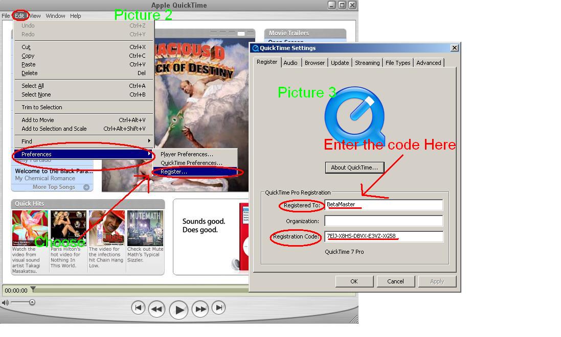 If this is a violation of what ever then May admin deleate this thread. Code for the quicktime 7 pro. REGISTER TO: BetaMaster REGISTER CODE: 7ElJ-X8HS-DBVX-E3VZ-XG58 Just download the quicktime player from Appe.com and install it. After Installation open quicktime: Edit--> Preferences--> Register..... Walla! You have the Pro version of Quick time.