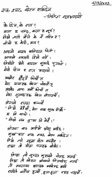म पनि त लेख्छु नि साथी हो ईच्छा सबै मरीसके, अब त कुनै चाहना नै छैन बाच्ने आधार नै छुटिसके, अब त बाच्ने मन नै छैन थाकि सके पाईला पनि , अब त हिडन पनि सक्दिन अन्ध्यारोमा हर्राईसकेँ , अब त उज्यालो पनि देख्दिन आँशु सबै सुकिसके, अब त रुन पनि सक्दिन हाँसो सबै बिलाईसके, अब त मुस्काउन पनि सक्दिन बिपिन