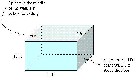 Well, the spider has to crawl along the wall; it cannot fly in the air. The floor is 30 ft x 12 ft, and the height of the room is 12 ft.