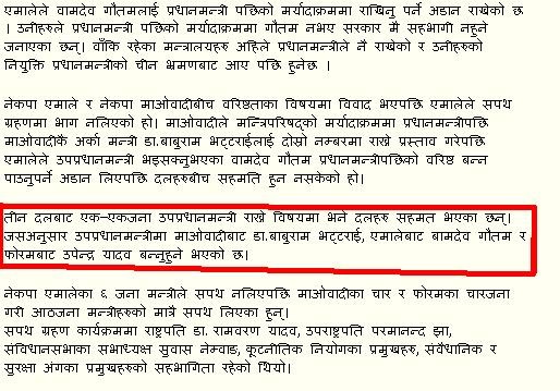 hahahhahaha....."Kahi na bhako jatra hadi gau ma".....NEW NEPAL.....kudos to our PRIME MINISTER for providing us to be served by not one,...not two...but three DEPUTY PRIMEMINISTER....I think we truly deserve this....JAYA NEW NEPAL